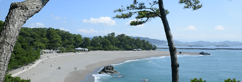 高知県を代表する景勝地の一つ。浦戸湾口、龍頭岬(りゅうずみさき)と龍王岬の間に弓状に広がる海岸で、背後に茂り合う松の緑と、海浜の五色の小砂利、紺碧の海が箱庭のように調和する見事な景勝地です。月の名所としても知られ、“月の名所は桂浜…”と「よさこい節」にも唄われています。東端の龍頭岬には、幕末の志士坂本龍馬の銅像が太平洋を見下ろすように建ち、山手には「坂本龍馬記念館」もあります。